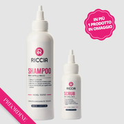 Kit detox composto da Shampoo e Scrub Detossinante Riccia per una pulizia profonda del cuoio capelluto.