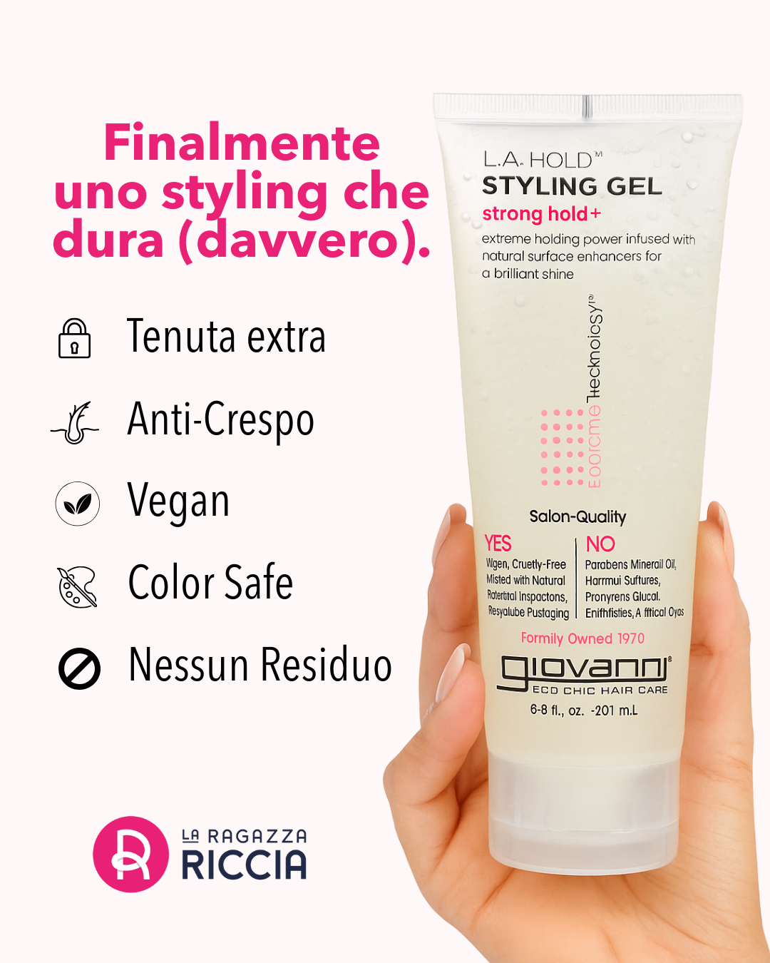 Il gel a tenuta estrema scelto da La Ragazza Riccia per definizione, controllo e brillantezza senza compromessi. Vegan, anti-crespo, color-safe. Solo per vere Ricciolute da palcoscenico.